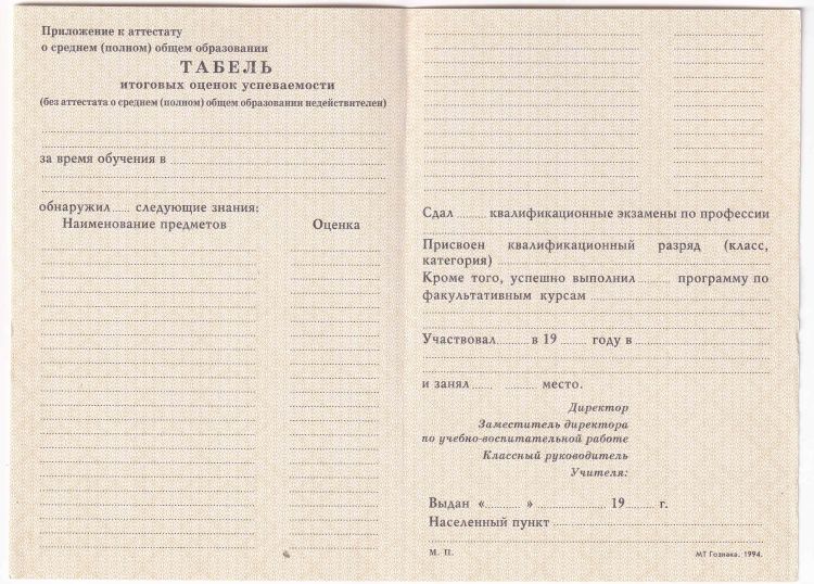 Аттестат школы за 11 классов, доступные с годами выдачи с 1994 по 2006. Используем оригинальные бланки ГОЗНАК с подписями и печатями, полная комплектация включает корочку, бланк аттестата и приложение.